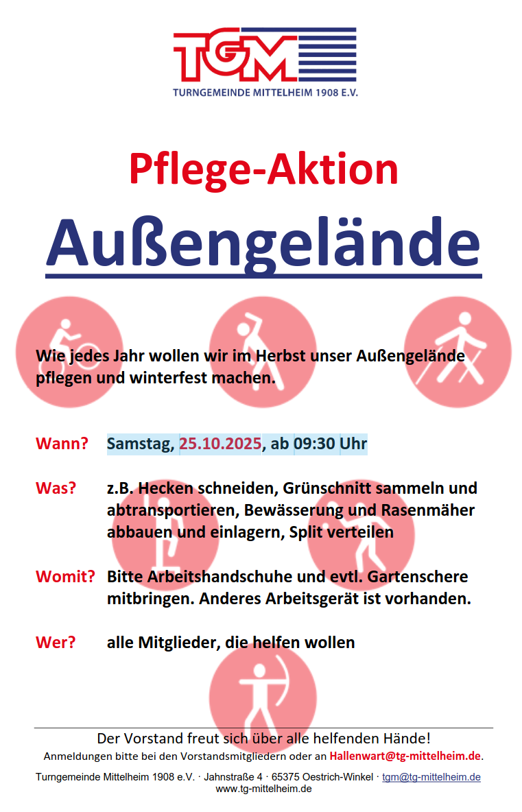 Es wäre schön wenn Ihr Euch bis Donnerstag, 11. September anmelden würdet (event@tg-mittelheim.de).