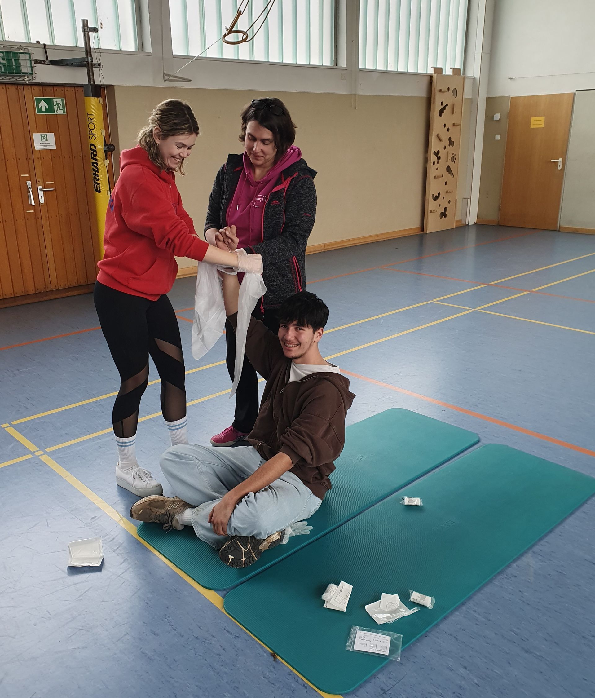Nach der verdienten Mittagspause, in der die Teilnehmerinnen und Teilnehmer von der TGM mit einem Snack-Buffet, selbstgebackenen Kuchen, Kaffee und Kaltgetränken versorgt wurden, sorgte das gegenseitig Anlegen von Verbänden zur Versorgung von Wunden und Knochenbrüchen für viel Gelächter. Der richtige Einsatz eines Defibrillators wurde sehr konzentriert geübt. Fragen zu Sportverletzungen und anderen Erkrankungen rundeten den Nachmittag ab.