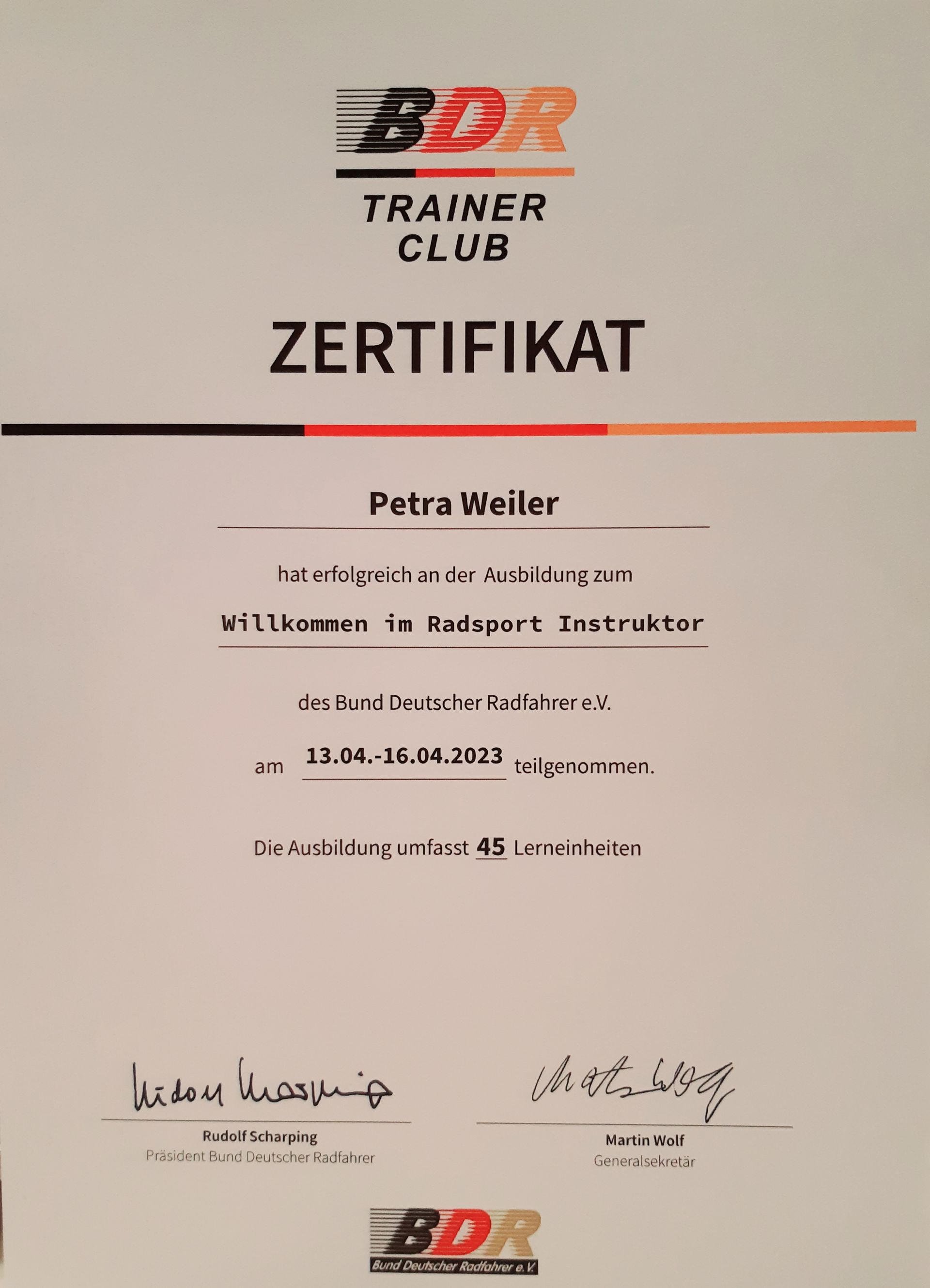 Die Ausbildung zum Kids Rad Instructor hat unsere Mountainbike Übungsleiterin Petra Weiler in den letzten Wochen im Rahmen des Lehrgangs "Willkommen im Radsport" des BDR erfolgreich durchlaufen. "Ich bin jetzt in der Vorbereitung des Kurses für die Kinder. Unsere Zielgruppe sind erst einmal die 6 - 8jährigen. Ich freue mich schon riesig, mit den ersten Kindern die Stationen des Kids Rad Diplom zu "erfahren". Dafür habe ich viele spielerische Übungen parat, die allmählich die Fähigkeiten der Kinder steigern", freut sich Petra. "Ich bin sicher, dass alle am Ende ihr Diplom bekommen".